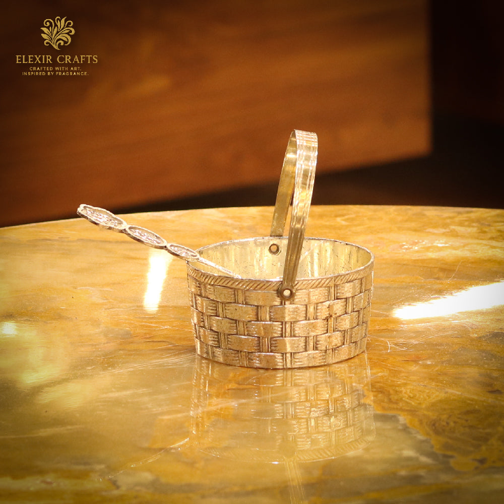 Discover the perfect blend of rustic charm and silver elegance with this hand-textured basket. Featuring a detailed woven-relief pattern and a matching ornamental spoon, this versatile piece is ideal for serving condiments or storing small keepsakes. Its polished handle and intricate finish make it a captivating accent for any refined tabletop.