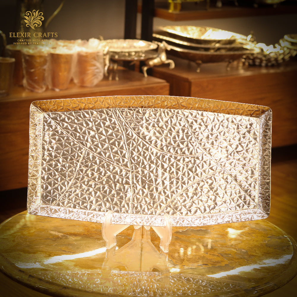 Experience the height of luxury with this hand-etched rectangular tray. It features a stunning display of regal scrollwork and floral motifs, framed by a decorative border and elegant curved handles. This masterfully crafted piece serves as a timeless centerpiece, perfect for grand celebrations or high-end home decor.