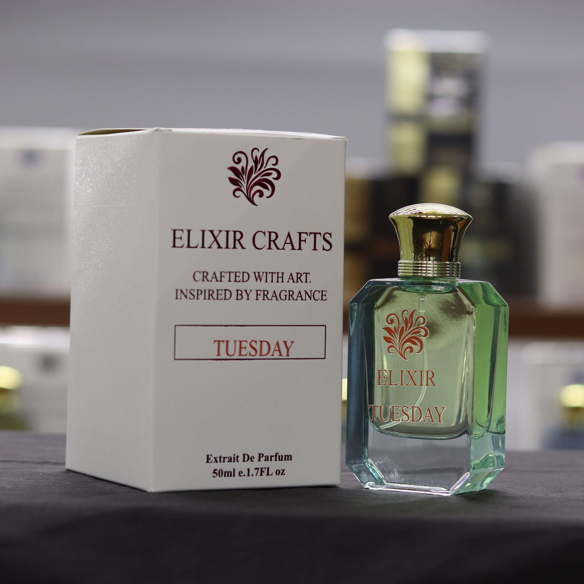 Elevate your daily routine with Tuesday, a premium Extrait De Parfum by Elixir Crafts. Housed in a sophisticated light-green glass bottle with a brilliant gold cap, this fragrance offers a high-concentration scent designed for lasting impact. It perfectly blends luxurious artisanal presentation with a refreshing, inspired aroma.